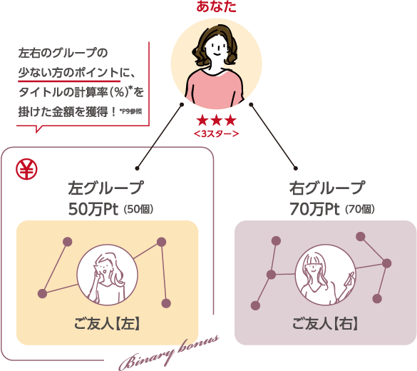 販売個数が少ない方がポイントにバイナリーボーナスでは、自身の下に左右2つのグループを構成します。左右それぞれのグループの月間販売個数が少ない方があなたのポイントとして換算されます。