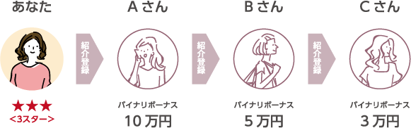 3段目まであなたのボーナスにスタートボーナスの特徴は、あなた自身が直接新規登録者を紹介しなくても、あなた経由で登録した方が別の人を新規登録者に紹介した際にも3段目までボーナスになります。